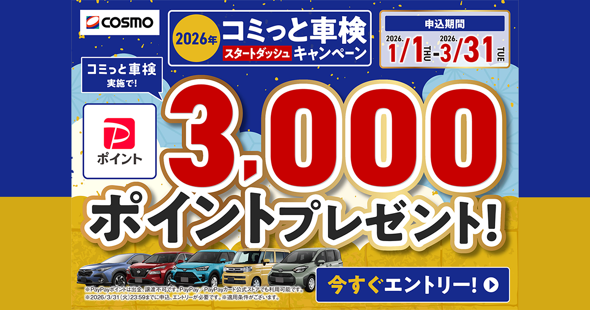 ≫コスモのコミっと車検 2026年スタートダッシュキャンペーン開催!もれなくPayPayポイント3,000ポイントがもらえる!②オンラインで見積もり・お申込み