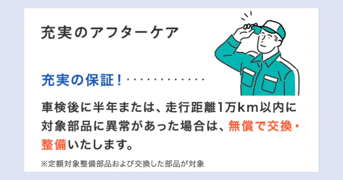 車検後に半年または、走行距離1万km以内に対象部品に異常があった場合は無償で交換・整備が可能。