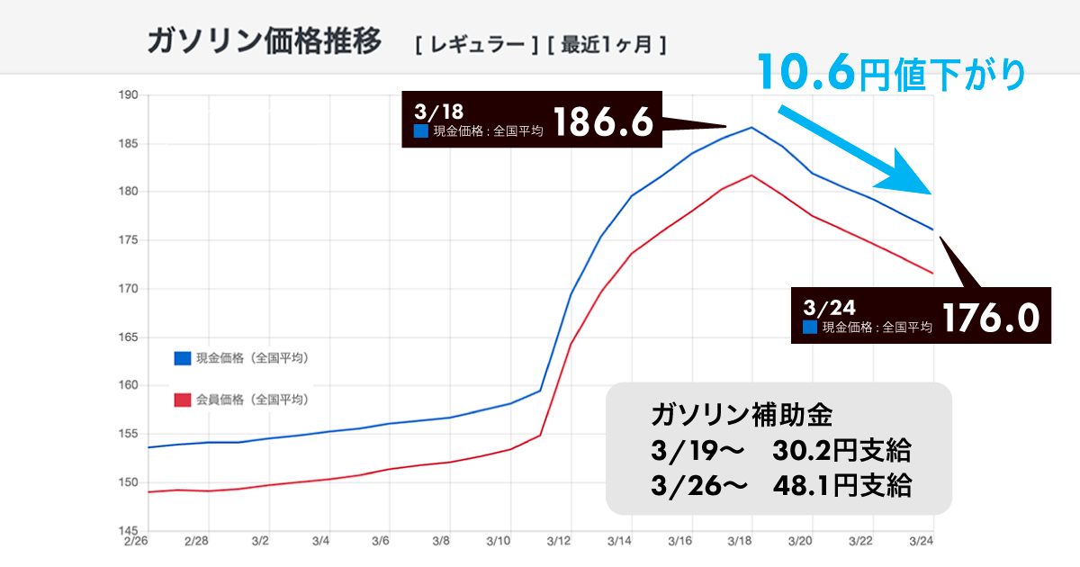 3月19日よりガソリン補助金が 30.2円支給されて、約1週間後 3月24日は 176.0円、10.6円の値下がりとなりました。