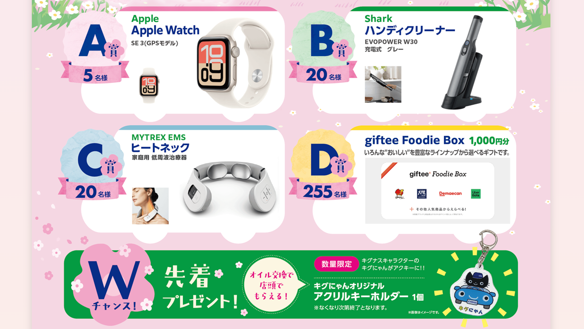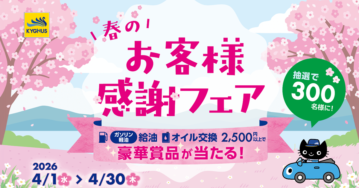 さらに!KYGNUSで給油・オイル交換を2,500円(税込)以上利用し、購入レシートにて応募された方の中から抽選で300名様に豪華賞品が当たる【春のお客様感謝フェア】も同時開催中です◎