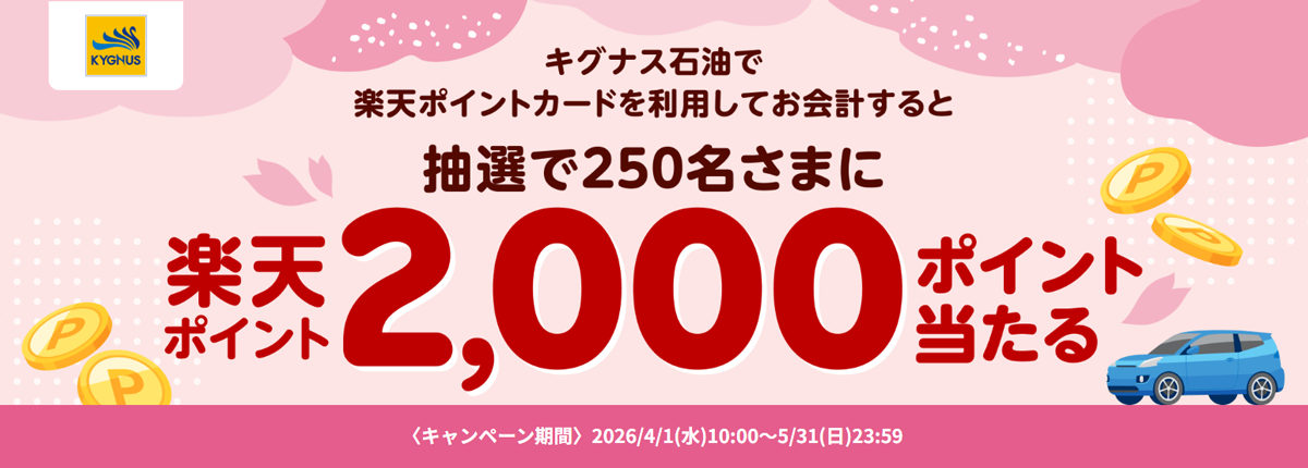 4月1日~4月30日までのキャンペーン期間中に、KYGNUSでガソリン・軽油の給油またはオイル交換を2,500円(税込)以上利用すると抽選で300名様に豪華賞品が当たるキャンペーンです。