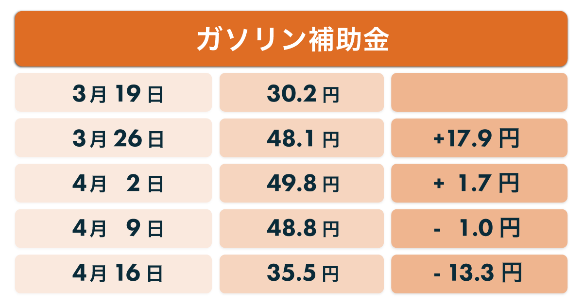 3月19日から再開された補助金は、レギュラーガソリン価格が170円を上回らないように、毎週支給額が決定します。
