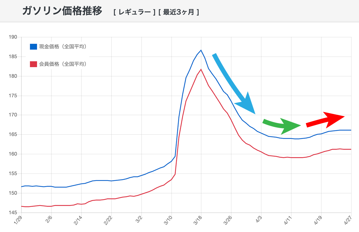 ガソリン補助金の支給が続いているため、僅かな値上がりに留まっていますが、例年ゴールデンウィークなど需要が増える時期は値上がりする傾向にあるため、お出かけ前に最新のガソリン価格を確認してから給油することをオススメします。