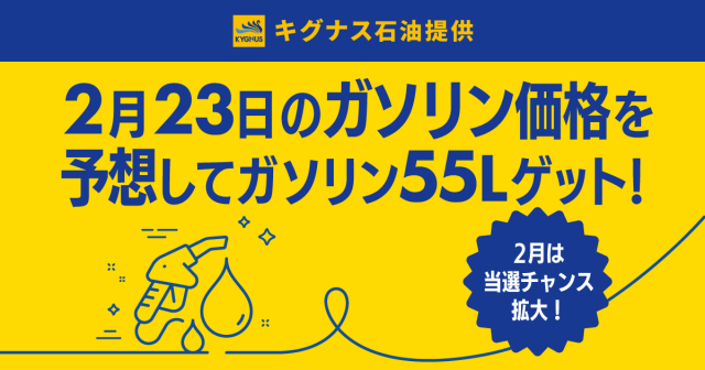 今年初の価格予想はキグナス石油提供☆当選枠を拡大してピタリ価格を正解された 先着5名様にガソリン55Lプレゼント。2月23日のガソリン価格を予想しよう。 締切は2月15日まで!皆さんの挑戦お待ちしております。