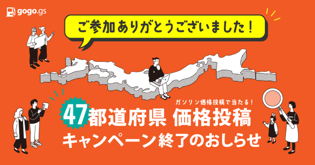 「47都道府県ガソリン価格投稿キャンペーン」は、1月31日をもって終了いたしました。ご参加いただいた皆さま、ありがとうございました!