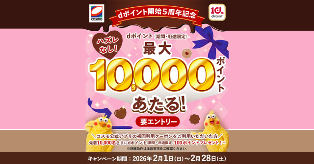 期間中は抽選でdポイントが最大10,000ポイントが当たります。さらに!公式アプリ初回ダウンロード特典クーポンを使えばdポイント100ポイントプレゼント。