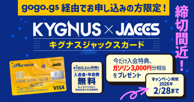 gogo.gsから「キグナスジャックスカード」に新規入会すると、通常のカード特典に加えて「キグナス石油で使える3,000円分デポジット」がもらえるキャンペーン実施中!